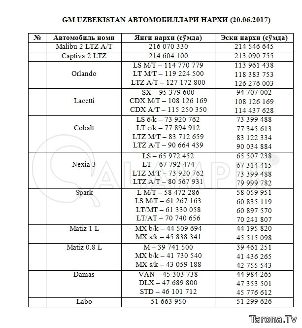 Quyida avtomobillarning yangi va eski narxlarini havola etamiz: