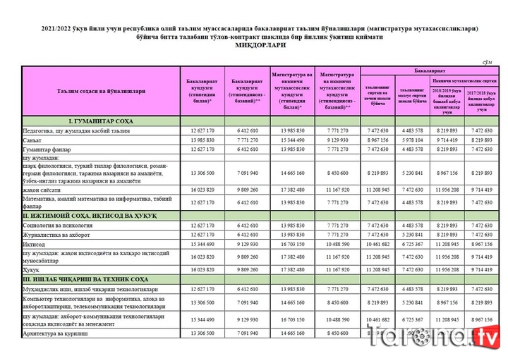 ![]() O‘zbekiston Respublikasi ta’lim muassasalariga o‘qishga qabul qilish bo‘yicha Davlat komissiyasining 6-son bayoni bilan pandemiya sharoitida respublika aholisining to‘lov qobiliyati pasayganligini hisobga olib, farzandi to‘lov-kontrakt asosida o‘qiydigan oilalarga yengillik yaratish va ularni qo‘llab-quvvatlash maqsadida, istisno tariqasida, 2021/2022-o‘quv yili uchun respublika oliy ta’lim muassasalarida bakalavriat ta’lim yo‘nalishlari (magistratura mutaxassisliklari) bo‘yicha bitta talabani to‘lov-kontrakt shaklida bir yillik o‘qitish qiymati miqdorlari tasdiqlandi. Bunda, oliy ta’lim muassasalarining kunduzgi ta’lim shaklida tahsil olib (bakalavriat va magistratura), 2021-yil 1-noyabrga qadar koronavirus infeksiyasiga qarshi emlangan (vaksina olgan) talabalarga 2021/2022-o‘quv yili uchun belgilangan stipendiyasiz bazaviy to‘lov-kontrakt miqdorlariga 10 foiz chegirma berilishi belgilandi.