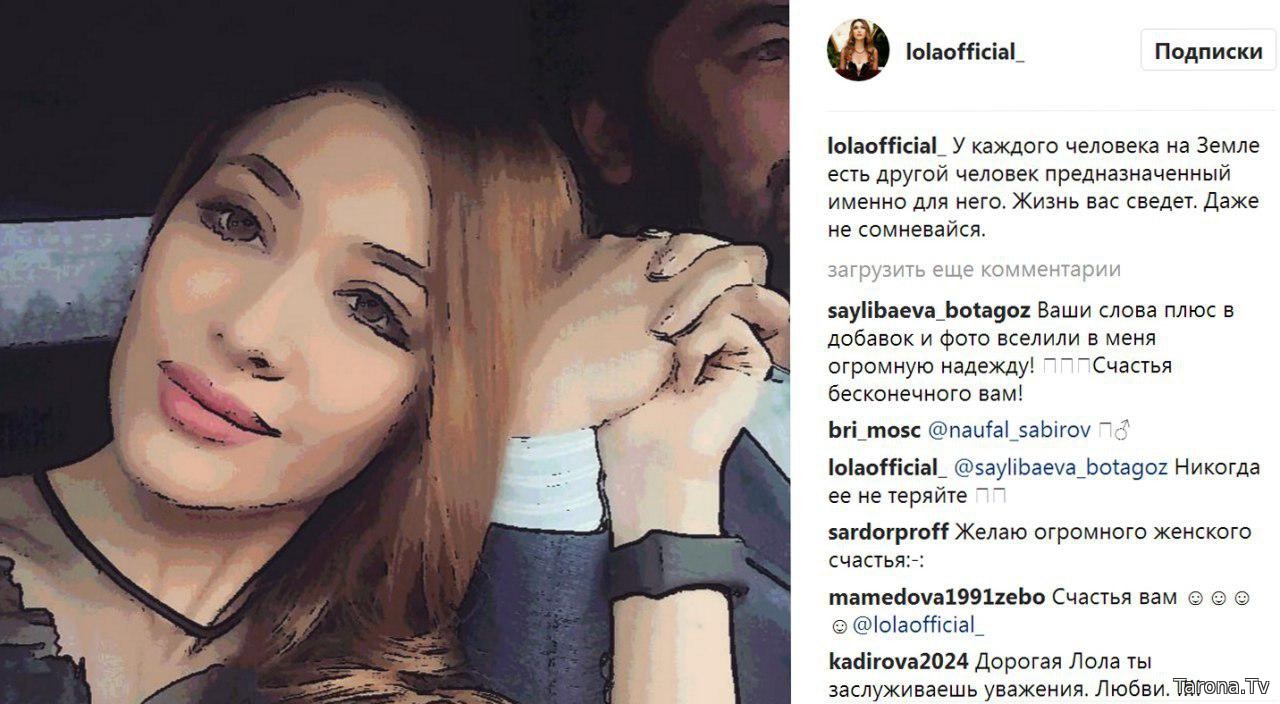 ![]() Xonanda Lolaning Instagram`ga joylagan yangi surati muxlislar tomonidan iliq kutib olindi va qizg‘in muhokamalarga sabab bo‘ldi. Xonanda o‘z intervyularida sevgan insonini uchratgani haqida ma’lumot bergan edi. Biroq u shu paytgacha sevgan insoni bilan tushgan suratini to‘lig‘icha ijtimoiy tarmoqlarga joylaganicha yo‘q. Lola ko‘ngil qo‘ygan insoni Moskvada yashashini ma’lum qilgandi. Lola sevgan insoni bilan qo‘l ushlashib tushgan suratini quyidagicha izohlaydi: "Er yuzidagi har bir insonning faqat uning uchun yaralgan jufti bor. Taqdir sizlarni albatta uchrashtiradi. Bunga shubha qilmang!" Mazkur surat qisqa fursat ichida 12 mingta "layk" yig‘di va unga 300 ga yaqin izohlar qoldirildi. Xonandaning hamkasblari, muxlislari unga baxt tilamoqda. Lola muxlislarining ayrim savollariga javob berar ekan, sobiq turmush o‘rtog‘iga atab hech qachon qo‘shiq aytmagani, uning qo‘shiqlarida ayol qalbi, taqdirlar aks etishini ta’kidladi. Shuningdek, Lola "Rashkchimisiz?" degan savolga "Ha!" deya javob berdi.