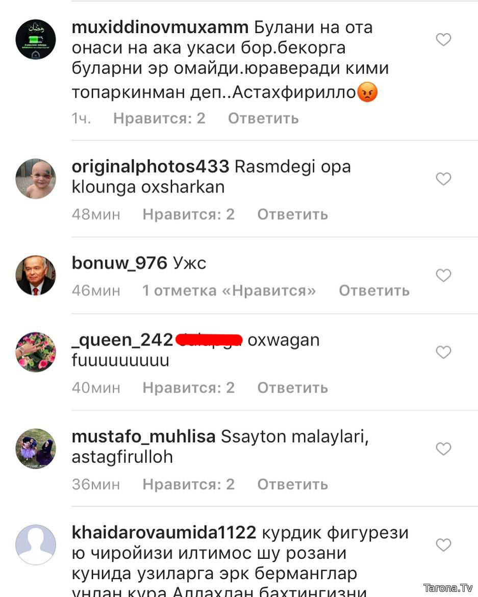 Aktrisa va boshlovchi Luiza Rasulovaning surati tanqidlarga va keng muhokamalarga sabab bo`ldi. Luiza Rasulova ana shunday haqoratli so`zlardan iborat bo`lgan sharhlarni skrin-shot qilib o`zining Instagramdagi sahifasiga joyladi. “Men bu gaplarga e`tibor bermaslikka harakat qildim, lekin uzr, bu narsa qo`limdan kelmadi. Odamlarga hayronman unday qilsang bunday deydi, bunday qilsang unday deydi. Faqat va faqat kamchilik topib, bir gala bo`lib g`iybat qilishsa bo`ldi. Shu narsadan semirishadimi deyman. Biz hammamiz san`at ichidagi odamlarmiz har doim harakatdamiz hozir Ro`zayi Ramazon oyi bo`lishiga qaramasdan biz yoki s`yomkada yoki sahnadamiz bekorchi ishlar bilan shug`ullanib yurganimiz yo`q. Oddiy bir misol keltiraman bugun ertalab klip jarayonidan video quydim, keyin bir pas unga yozilayotgan izohlarga qarab turdim, nima emish uyalmaysizmi shunday kunlarda kalta ko`ylak kiygani, ming lanat senga diyishadimiey. Ota-onamni qo`shib xaqoratlashadimiey... Bitta narsani aytaman, biz o`zimiz tanlamaymiz klipga nima kiyib, nimada tushishni, buni liboslar buyicha dizayner va rejissyor xal qiladi. Odamlar aql o`rgatib, o`zini Hudojo`y qilib ko`rsatishadi lekin yozayotgan gaplari umuman bir-biriga to`g`ri kelmaydi. Judayam achinarli holat, shunchalik aqlli ekansizlar nahotki bilmaysiz, birovni so`kib haqorat qilish gunohligini, nafaqat so`kinish balki g`iybat ham katta gunoh. Bir odamni muhokama qilish ham gunoh. Bunday insonlarga faqatgina achinaman xolos. Insof so`rayman sizlarga. Ozgina yozayotgan gapinglarga e`tibor berishga harakat qilinglar, tilinglarni ushlab turolmasangiz ham. Meni hayotimga hech kimni aralashishga hattoki qanday kiyinib yurish turishimga ham baho berishga hech kimning haqqi yo`q, oilamdan boshqa. Mayli hammamiz ham Hudoning bir gunohkor bandalarimiz, men o`z qilgan ishlarim uchun yurish turishim va hattoki kiyinishim uchun ham narigi dunyoda o`zim javob beraman, hech kim men qilgan ish uchun javob bermaydi. Sizlar o`zingiz uchun javob berishni o`rganinglar. Sizlardan bir iltimosim bor biz ijodkor insonlarni tug`ri tushunishingizni va qilayotgan kichkinagina ijodimizni ko`rib bahramand bo`lishingizni hohlardim. Bu hayotimiz o`zi qisqa uni esa har xil bo`lar-bo`lmas ishlarga sovurmaylik. To`g`ri barchangiz birdek o`z fikringizni yozishga haqqingiz bor, lekin bu ish noto`g`ri deb uylayman, undan ko`ra o`sha odamning erishayotgan yutuqlaridan qilayotgan ijodidan fahrlanishni o`rganing. Rahmat”, deya fikrini muhtasar qildi Luiza Rasulova. Luizaning aynan qaysi surati bunday tanqidlarga sabab bo`lgani ma`lum emas.