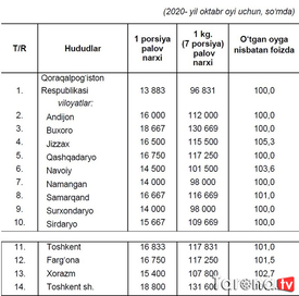 ![]() O‘zbekiston viloyat markaziy hududlari kesimida tayyor palovning o‘rtacha narxlari to‘g‘risida ma'lumot berildi.Davlat statistika qo‘mitasi tomonidan mamlakatning markaziy hududlaridagi umumiy ovqatlanish muassasalari (osh markazlari)da kuzatuv o'tkazildi. Qayd etilishicha, kuzatuv natijalari bo‘yicha palovning o‘rtacha narxlari quyidagi ko‘rinishga ega bo‘ldi: Bildirilishicha, narxlarni ro‘yxatga oluvchi tomonidan kuzatuv o‘tkazilgan kun va vaqtdagi narx-navo qayd etilib, bunda vaqt va joyiga qarab narxlar o‘zgarib turadi. Mazkur ma'lumotlarning shakllanishi jarayonida faqatgina tanlab olingan umumiy ovqatlanish muassasalari (osh markazlari)dagi palovning o‘rtacha narxlari hisobga olingan bo‘lib, restoran va choyxonalardagi narxlar inobatga olinmagan.