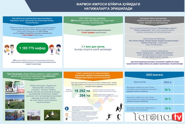 tuman (shahar) va mahallalarda jismoniy tarbiya-sog‘lomlashtirish infratuzilmasi shakllantiriladi; (9 146 ta mahallada 18 292 ta jismoniy tarbiya-sog‘lomlashtirish va sport maydonchalari, 2021-2022 yillarda 204 ta tuman (shahar)da jami 831 km piyodalar va velosiped yo‘laklari barpo etiladi) ta’lim muassasalarining sport infratuzilmasi rivojlantiriladi; (2021—2025-yillar davomida 600 ta umumta’lim maktabida sport zallari quriladi, sport inventarlari bilan jihozlash uchun har yili 9 942 ta maktabga hamda 6 021 ta maktabgacha ta’lim tashkilotiga zarur mablag‘lar ajratiladi) aholining barcha qatlamlari, ayniqsa, bolalar va yoshlar orasida sport targ‘iboti kuchaytiriladi: a) bog‘cha yoshidagi bolalar «Bolalikdan sportga», «Tonggi gimnastika» kabi sport mashg‘ulotlarini o‘tkazish natijasida sog‘lomlashtiriladi; b) umumta’lim maktablarida «Biz bilan bajar, bizdek bajar, bizdan yaxshiroq bajar!», «Quvnoq startlar» sinflararo sport musobaqalarini o‘tkazish natijasida sport bilan shug‘ullanuvchi o‘quvchilar soni oshadi; v) oilalar o‘rtasida o‘tkaziladigan «Otam, onam va men — sportchilar oilasi!» sport musobaqalarini o‘tkazish natijasida ommaviy sport bilan shug‘ullanuvchilar soni 6,1 mln.ga oshadi. 2025-yilga qadar jismoniy tarbiya va sport bilan muntazam shug‘ullanadigan aholining umumiy soni kamida 30 foizga yetkaziladi.