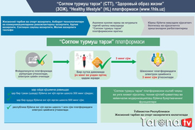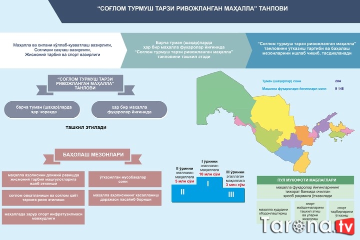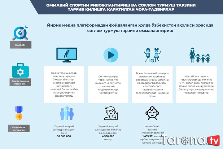 ![]() Jismoniy tarbiya va ommaviy sportni rivojlantirish bo‘yicha oxirgi yillarda bir qator normativ-huquqiy hujjatlar qabul qilingan. Ushbu hujjatlar doirasida amalga oshirilgan chora-tadbirlar natijasida oxirgi uch yilda sport bilan shug‘ullanuvchi umumiy aholi soni 4,8 mln nafardan (14,7 foiz) 5,6 mln nafargacha (16,5 foizga), shu jumladan, sport bilan shug‘ullanuvchi 30 yoshgacha bo‘lgan yoshlar soni 20,8 foizdan 28,5 foizga oshirildi. Sportchilar tomonidan xorijiy davlatlarda o‘tkazilgan jahon va qit’a chempionatlari, jahon kubogi kabi nufuzli xalqaro musobaqalarda jami 991 ta medal (355 ta oltin, 305 ta kumush, 331 ta bronza) qo‘lga kiritildi. Shu bilan birga, jahonda COVID-19 koronavirusi pandemiyasining yuzaga kelishi dunyo mamlakatlari qatori O‘zbekistonda ham mamlakatimiz aholisining sog‘lig‘i, jismonan salomatligi, sog‘lom hayot kechirish darajasi zaif ekanligini ko‘rsatdi. COVID-19 koronavirus infeksiyasi, avvalo, yurak-qon tomir va nafas olish yo‘llari hamda semizlik (ortiqcha vazn) kasalligiga chalingan fuqarolarimizning sog‘lig‘iga salbiy ta’sir ko‘rsatdi. Natijada, bugungi pandemiya oramizdan ko‘plab fuqarolarimizni bevaqt dunyodan ko‘z yumishiga sabab bo‘ldi. Barchamiz bundan jiddiy xulosa qilgan holda zararli odatlardan voz kechib, ommaviy sport bilan doimiy shug‘ullanish, to‘g‘ri ovqatlanish tamoyillariga rioya qilish, xususan, tarkibida tuz, qand va yog‘ miqdori ko‘p bo‘lgan hamda xamirli taom va shirinliklarni, non mahsulotlarini me’yoridan ortiq iste’mol qilmaslikni, bir so‘z bilan aytganda sog‘lom turmush tarzini kundalik xayotimizga kiritishimiz zarur ekanligini bugungi davrning o‘zi taqozo etmoqda. Global pandemiyaning salbiy oqibatlarini yumshatish hamda har bir fuqaroda jismoniy tarbiya va ommaviy sport bilan muntazam shug‘ullanish hamda sog‘lom turmush tarzi bo‘yicha hayotiy ko‘nikmalarini shakllantirish orqali aholida kasallikka qarshi kuchli immun tizimini shakllantirish maqsadida O‘zbekiston Respublikasi Prezidentining «Sog‘lom turmush tarzini hayotga keng tatbiq etish va ommaviy sportni yanada rivojlantirish chora-tadbirlari to‘g‘risida»gi Farmoni qabul qilindi. Ushbu Farmon bilan: 1) aholi o‘rtasida ommaviy sportni rivojlantirish va sog‘lom turmush tarzini targ‘ib qilishda — yurish, yugurish, mini-futbol, velosport, badminton, stritbol, «Workout» (mahalla va ko‘cha fitnesi)ni sportning ustuvor turlari etib belgilash; 2) aholini kunlik yurish va yugurishga targ‘ib qilish maqsadida «Sog‘lom turmush tarzi» (www.1hls.uz) platformasini yaratish. Bunda: bir sutka davomida 10 ming va undan ortiq qadam yurgan 18 va undan yuqori yoshdagi O‘zbekiston Respublikasi fuqarosining elektron hamyoniga 3 ming so‘m; bir oyda bir marta tuman (shahar) bo‘yicha eng ko‘p yurgan shaxsga 300 ming so‘m, hududlar bo‘yicha eng ko‘p yurgan shaxsga 500 ming so‘m, respublika bo‘yicha eng ko‘p yurgan shaxsga 1 mln so‘m qo‘shimcha ravishda platformadagi elektron hamyoniga o‘tkaziladi; (moliyalashtirish aholi salomatligi uchun zararli bo‘lgan mahsulotlar ishlab chiqaruvchilardan maxsus yig‘im joriy etish hisobidan amalga oshiriladi) 3) har bir tuman markazi va shaharlarda piyoda va velosipedda yurish uchun «Salomatlik yo‘laklari»ni tashkil etish. Bunda quyidagilar nazarda tutilmoqda: piyodalar va velosiped yo‘laklarining umumiy uzunligi 3-5 kmni tashkil etishi hamda o‘zaro uzviy bog‘liq bo‘lishi; zamonaviy, energotejamkor (harakat sensorlari bilan jihozlangan) yoritish tizimlari va yorug‘lik qaytaruvchi, yo‘laklarning boshlanishi, oralig‘i va yakunini ko‘rsatuvchi yo‘l belgilari bilan to‘liq ta’minlanishi; piyodalar va velosiped yo‘laklarini barpo etishda alohida harakatlanish imkoniyatlarini yaratish hamda nogironligi bo‘lgan shaxslar uchun «to‘siqsiz muhit» tashkil etish; 4) hududlarda yangidan barpo etilayotgan ko‘p qavatli turar joylar qurish bo‘yicha tasdiqlangan amaldagi shaharsozlik normalariga quyidagilarni nazarda tutuvchi o‘zgartirishlar kiritish: aholi soni va uy-joylarning joylashuvini inobatga olgan holda, shuningdek, tashkilotlarning tegishli hududlarida velosiped turar joylari va zamonaviy sport maydonchalarini tashkil etish; mahallalar, qishloqlar, tumanlar va shaharlarni bog‘lovchi avtomobil yo‘llari, piyoda hamda velosiped yurishi uchun mo‘ljallangan «Salomatlik yo‘laklari»ni qurish; 5) 204 ta tuman (shahar)dagi 9 146 ta mahalla fuqarolar yig‘inida har chorakda «Sog‘lom turmush tarzi rivojlangan mahalla» tanlovlarini tashkil etish; (tanlovda birinchi o‘rinni egallagan mahalla 10 mln so‘m, ikkinchi o‘rin uchun 5 mln so‘m va uchinchi o‘ringa 3 mln so‘m miqdorida pul mukofoti bilan rag‘batlantiriladi. Pul mukofoti mahallalarda sport maydonchalarini tashkil etish va ularni jihozlashga yo‘naltiriladi) 6) maktabgacha va umumta’lim muassasalarini birlamchi sport jihozlari va anjomlari bilan ta’minlash; (ushbu maqsadlar uchun 2021-yilda 6 021 ta maktabgacha ta’lim tashkilotiga 2 mln so‘mdan, 9 942 ta umumta’lim muassasasiga 5 mln so‘mdan ajratiladi) 7) davlat organlari va tashkilotlarida sog‘lom turmush tarzi va ommaviy sportni rivojlantirish maqsadida 2021-yil 1-yanvardan boshlab: mehnat jamoalarida faoliyat yuritayotgan xodimga «Sport targ‘ibotchisi» qo‘shimcha vazifasini yuklash va uning ish haqiga 20 foiz miqdorda ustama belgilash yo‘lga qo‘yiladi; ish vaqtidan so‘ng haftada kamida bir marta rahbar va barcha xodimlari jismoniy tarbiya va sport mashg‘ulotlari (yugurish, stritbol, futbol, badminton, voleybol, basketbol, stol tennisi, suzish va boshqalar) bilan shug‘ullanishi ta’minlanadi; har shanba kuni soat 14:00 dan so‘ng xodimlar va ularning oila a’zolari o‘rtasida yugurish, stritbol, futbol, badminton, voleybol, basketbol, stol tennisi, suzish va boshqa sport turlari bo‘yicha ommaviy sport musobaqalari tashkil etiladi; birinchi rahbarla